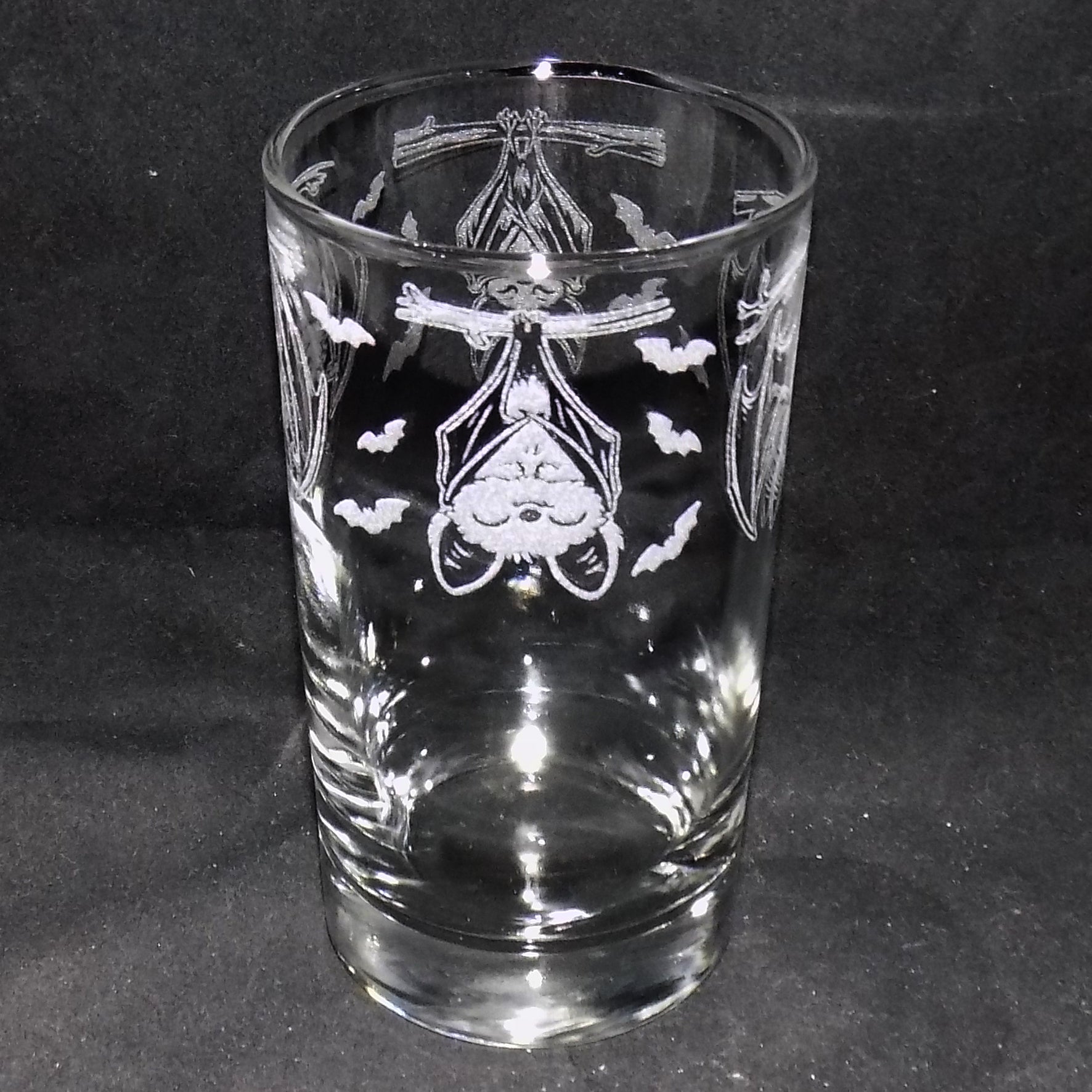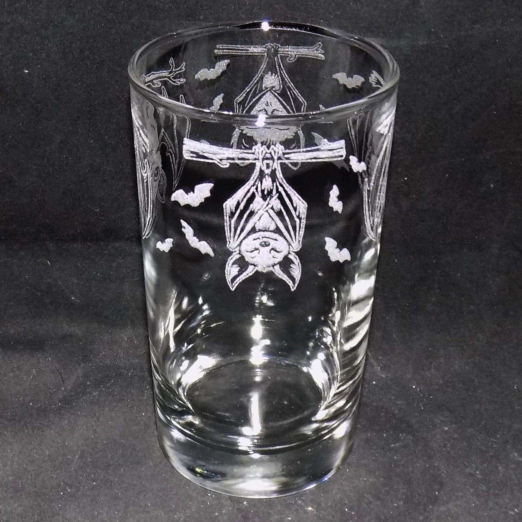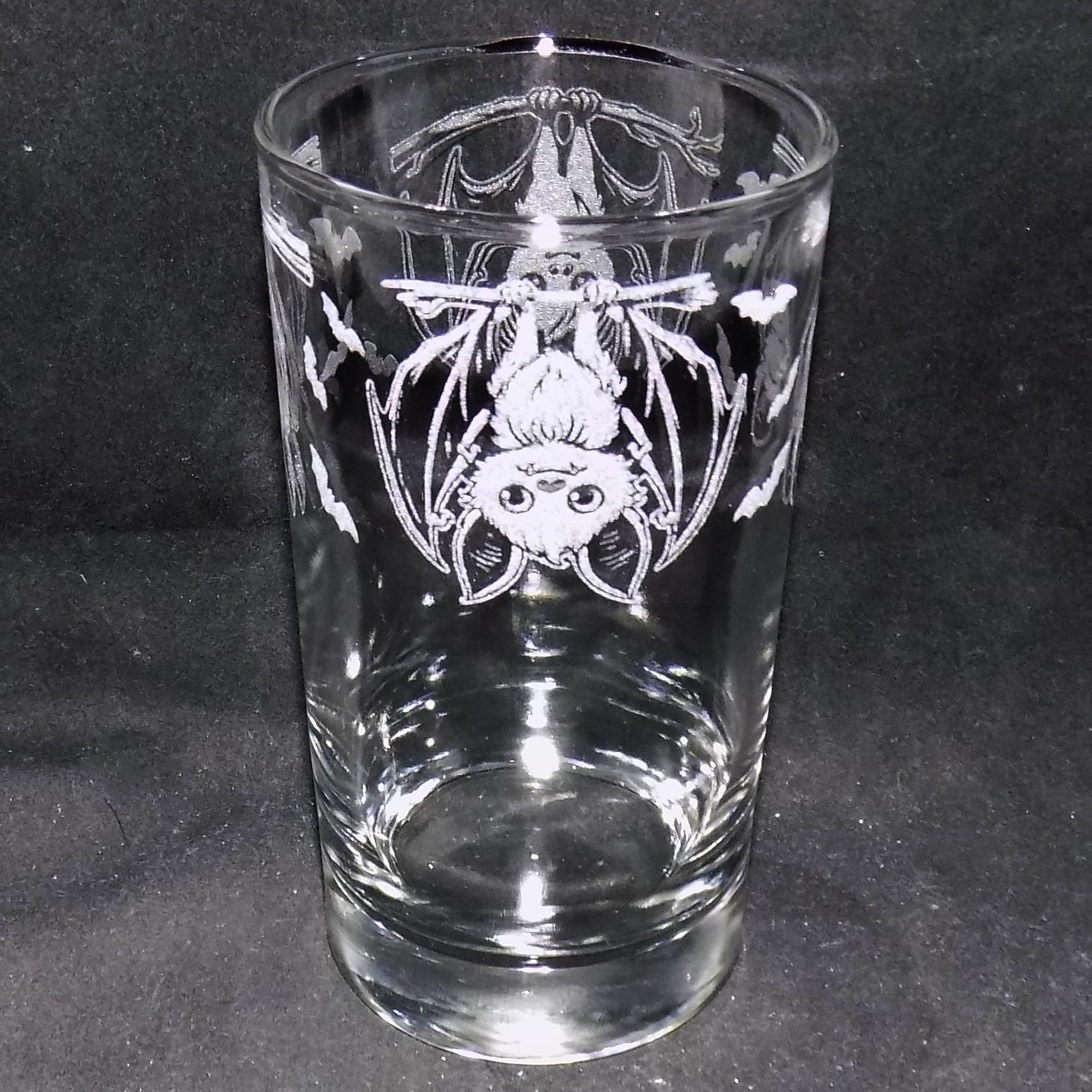 This tall glass features a humorous design of beautifully engraved bat designs around the rim of the glass. This is the perfect gift for those who admire the bat and like something different. Ideal for both special occasions and daily use, its elegant craftsmanship adds personality to any setting. Perfect for enjoying a variety of beverages, this large half-pint highball glass combines style and functionality.
