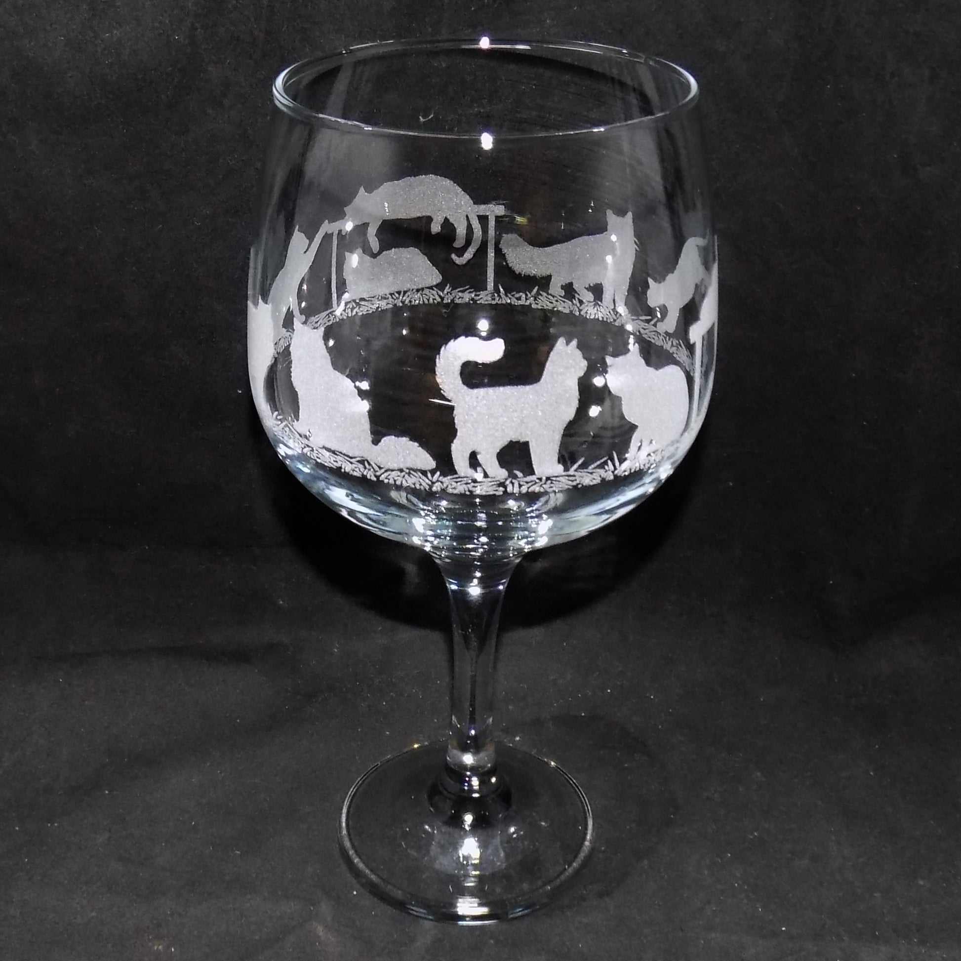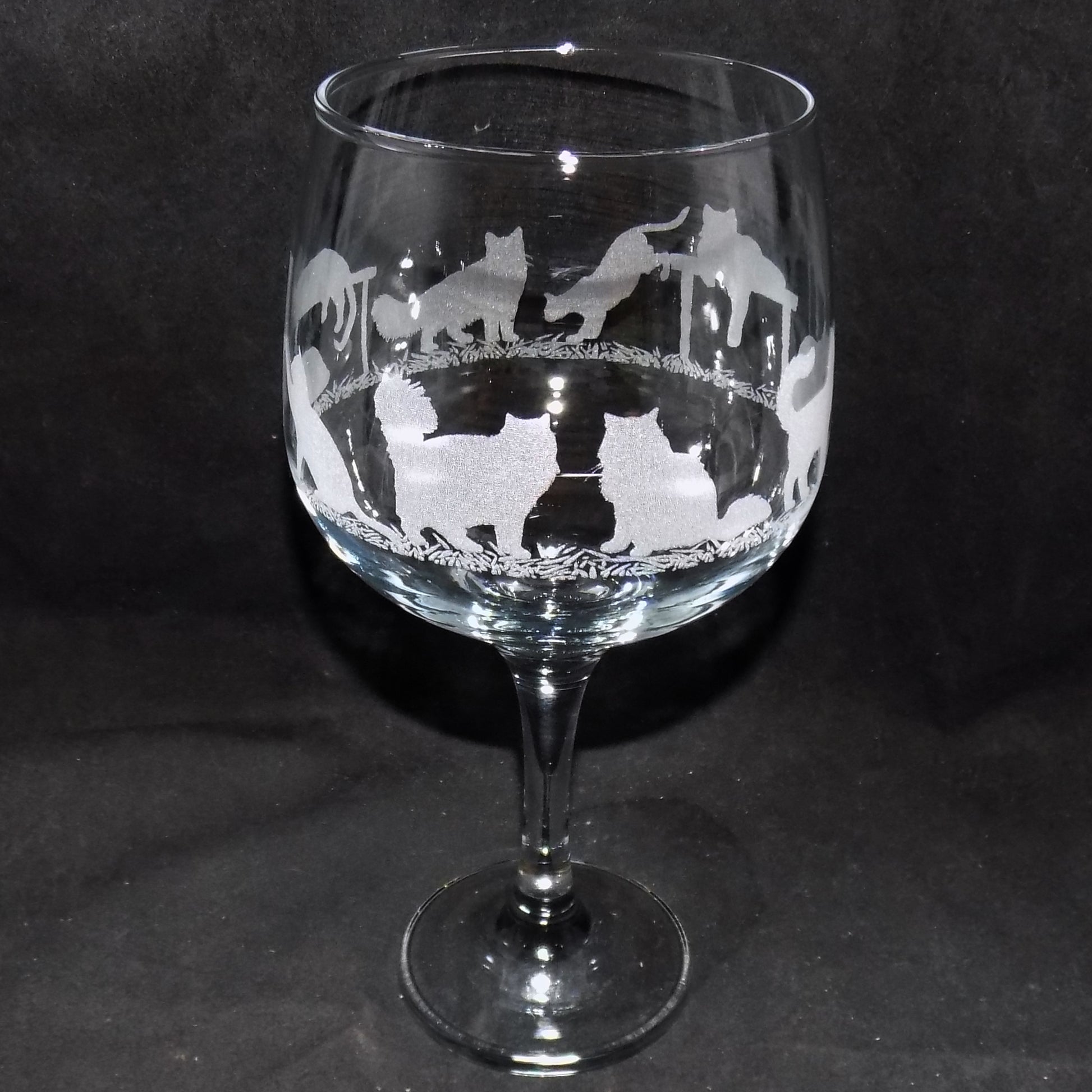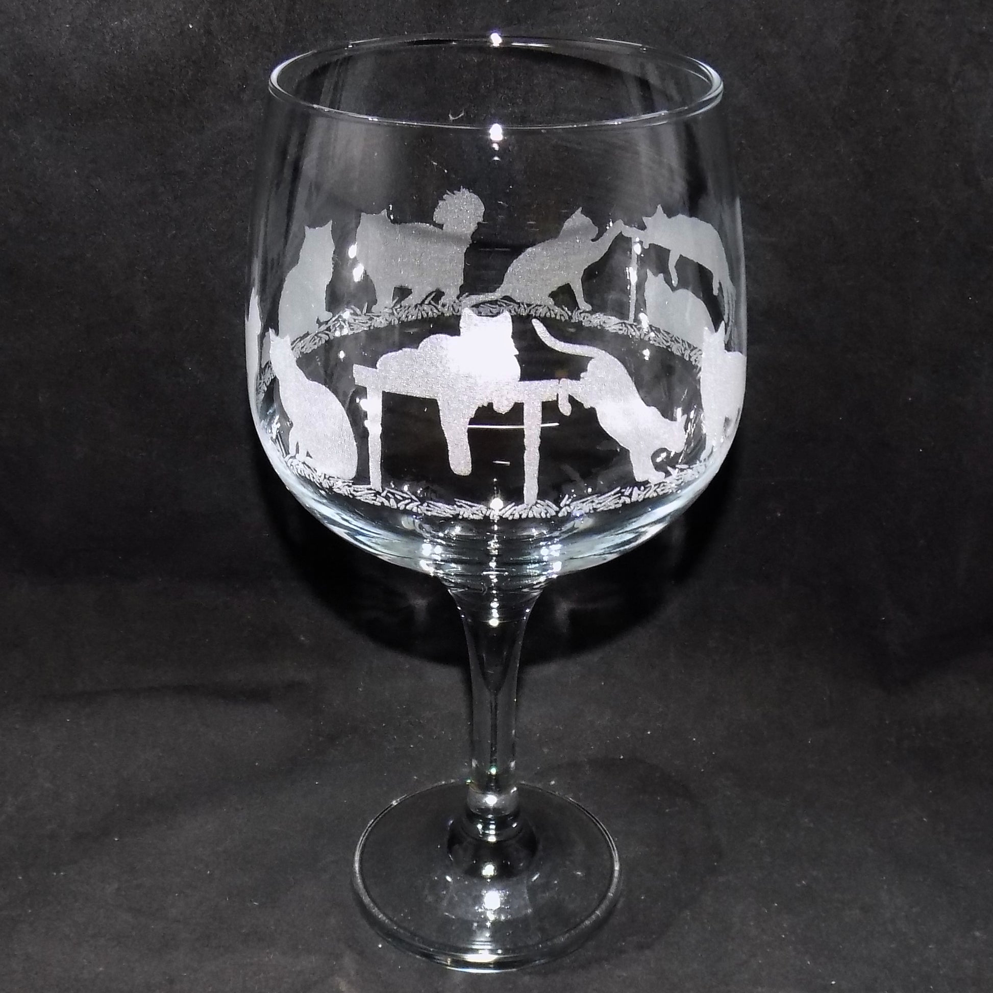 This lovely and unique gin glass is a wonderful gift for someone who has, admires or wants to celebrate an old friend, their cat. This glass has a stunning design of a variety of cat images around the large bowl. Exclusively designed and hand etched by us, using laser engraving.