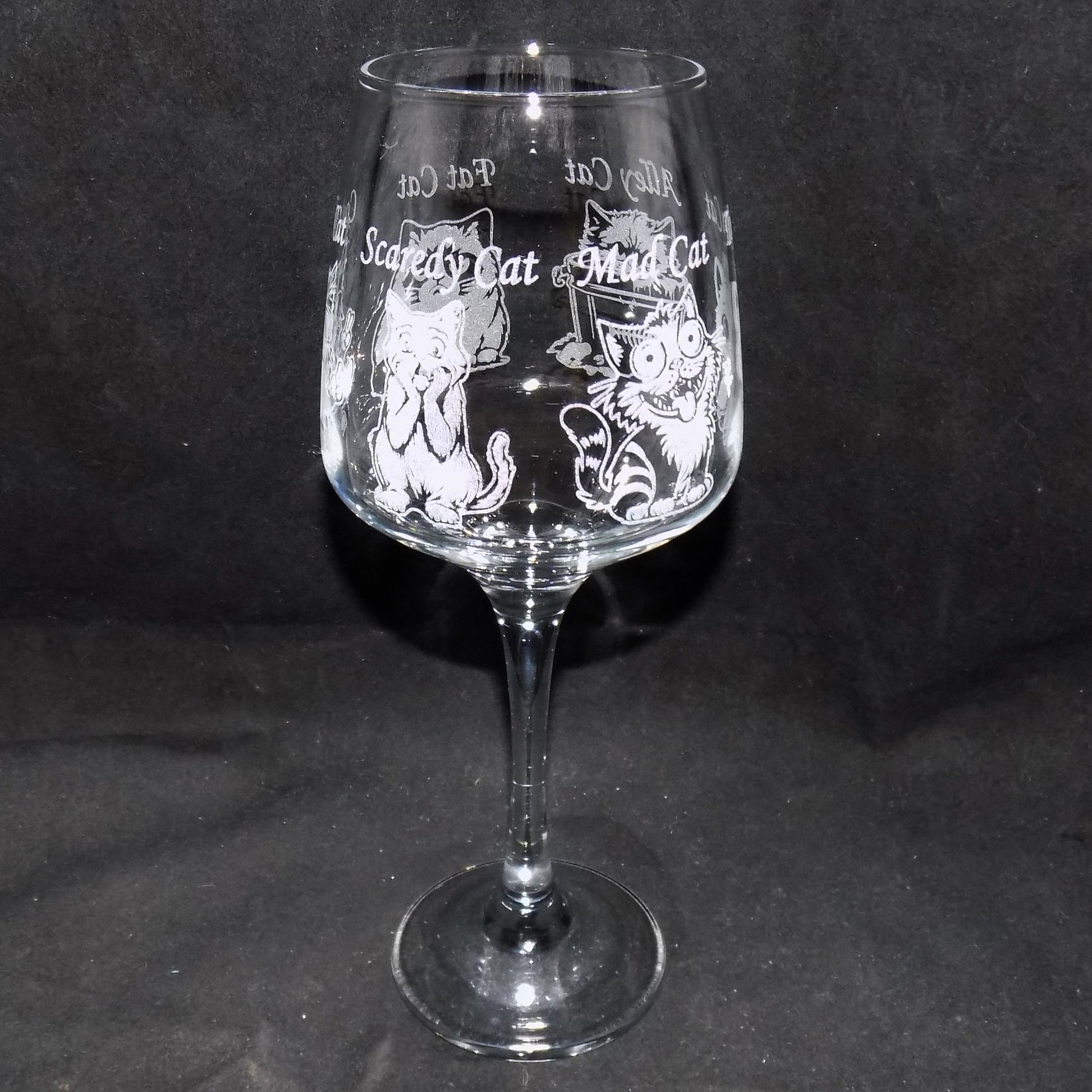 This unique wine glass, featuring the various cat personalities around the base of the bowl. It makes a thoughtful gift or a humorous addition to your own collection. Perfect for special occasions or everyday use, it combines fine craftsmanship with personal flair, suitable for both alcoholic and non-alcoholic beverages.