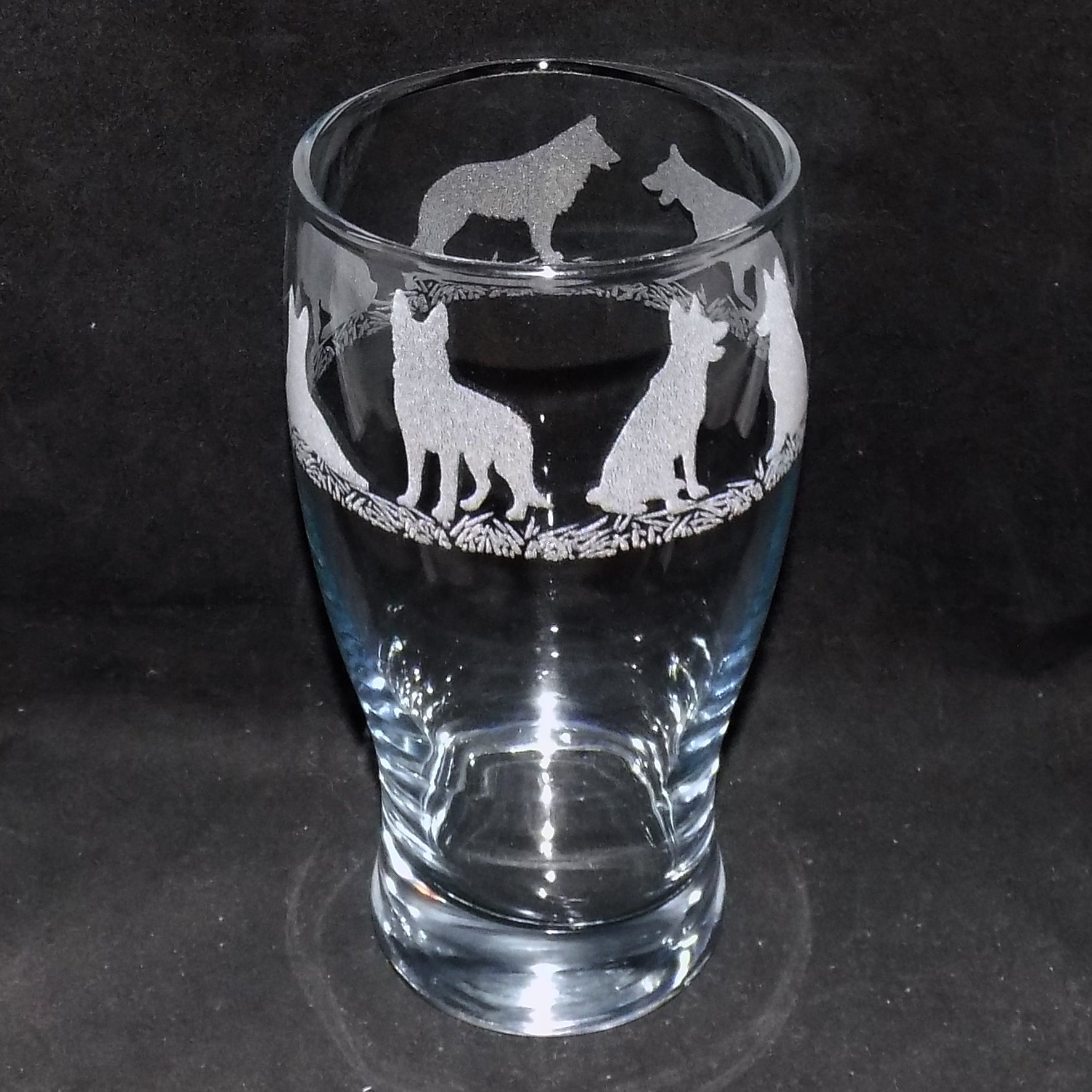 This robust, heavy pint glass is a wonderful gift for someone who has, admires the German Shepherd. The glass has a stunning design of a variety of German Shepherd images around the rim of the glass.