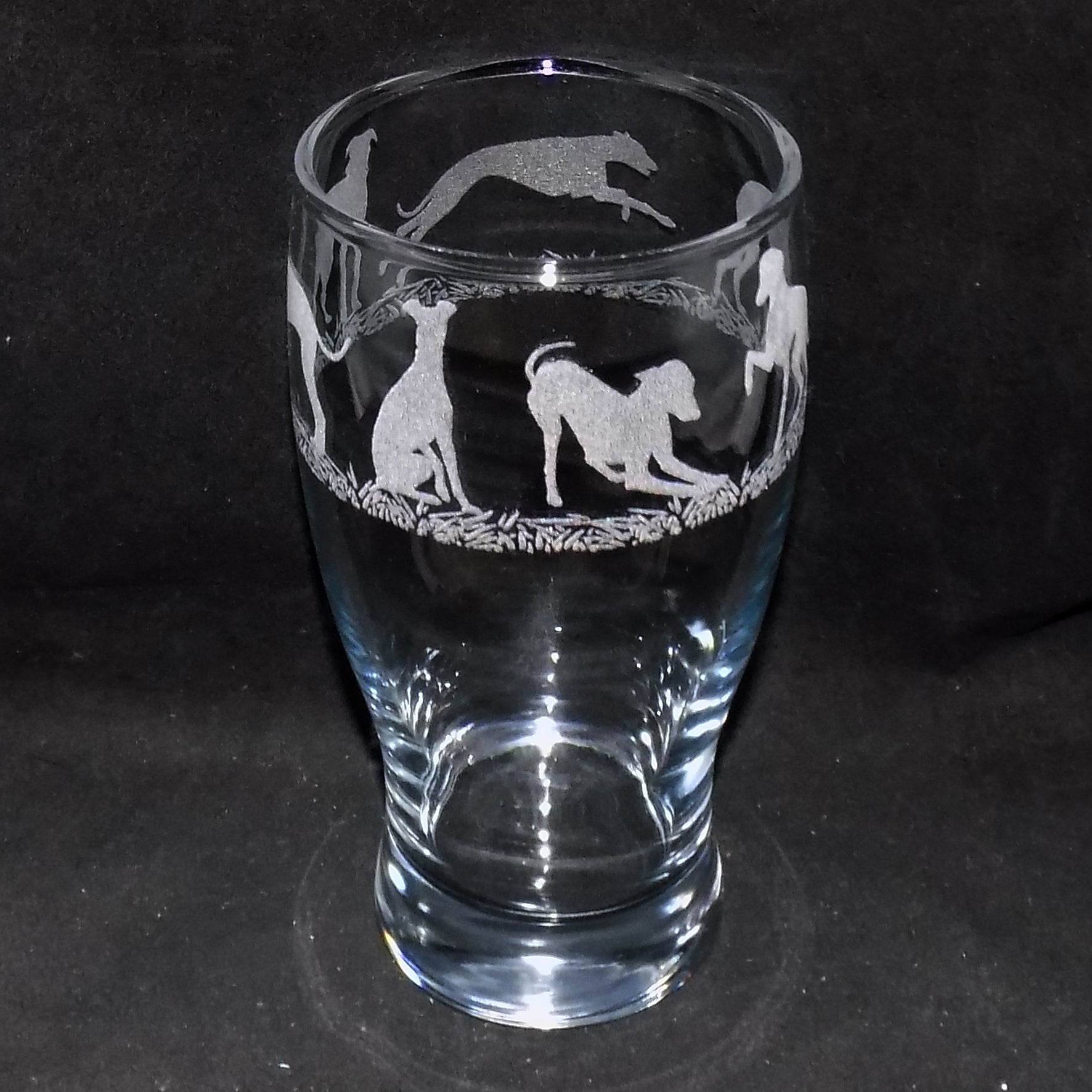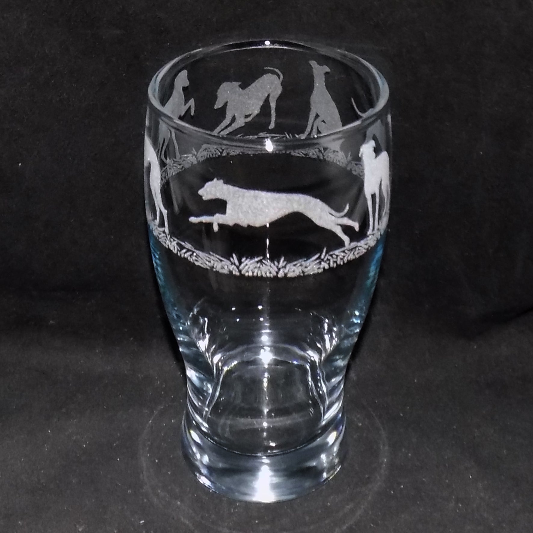 This robust, heavy pint glass is a wonderful gift for someone who has, admires the Greyhound. The glass has a stunning design of a variety of Greyhound images around the rim of the glass.