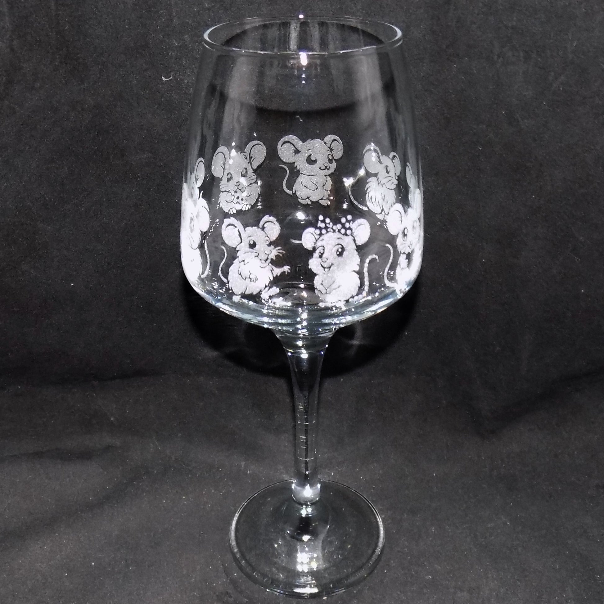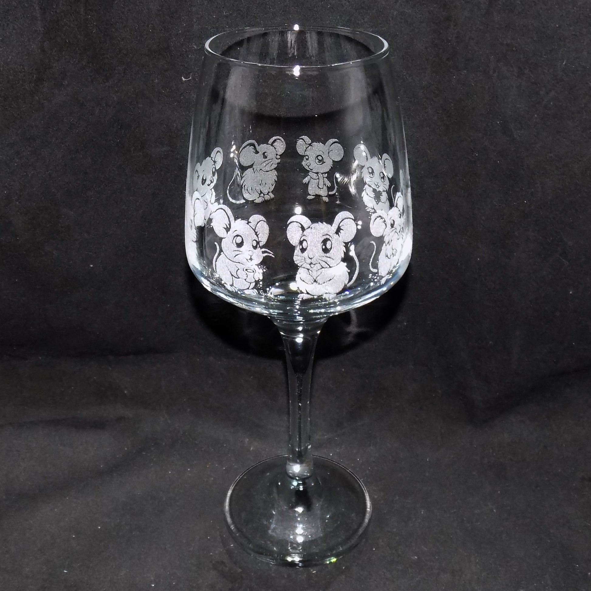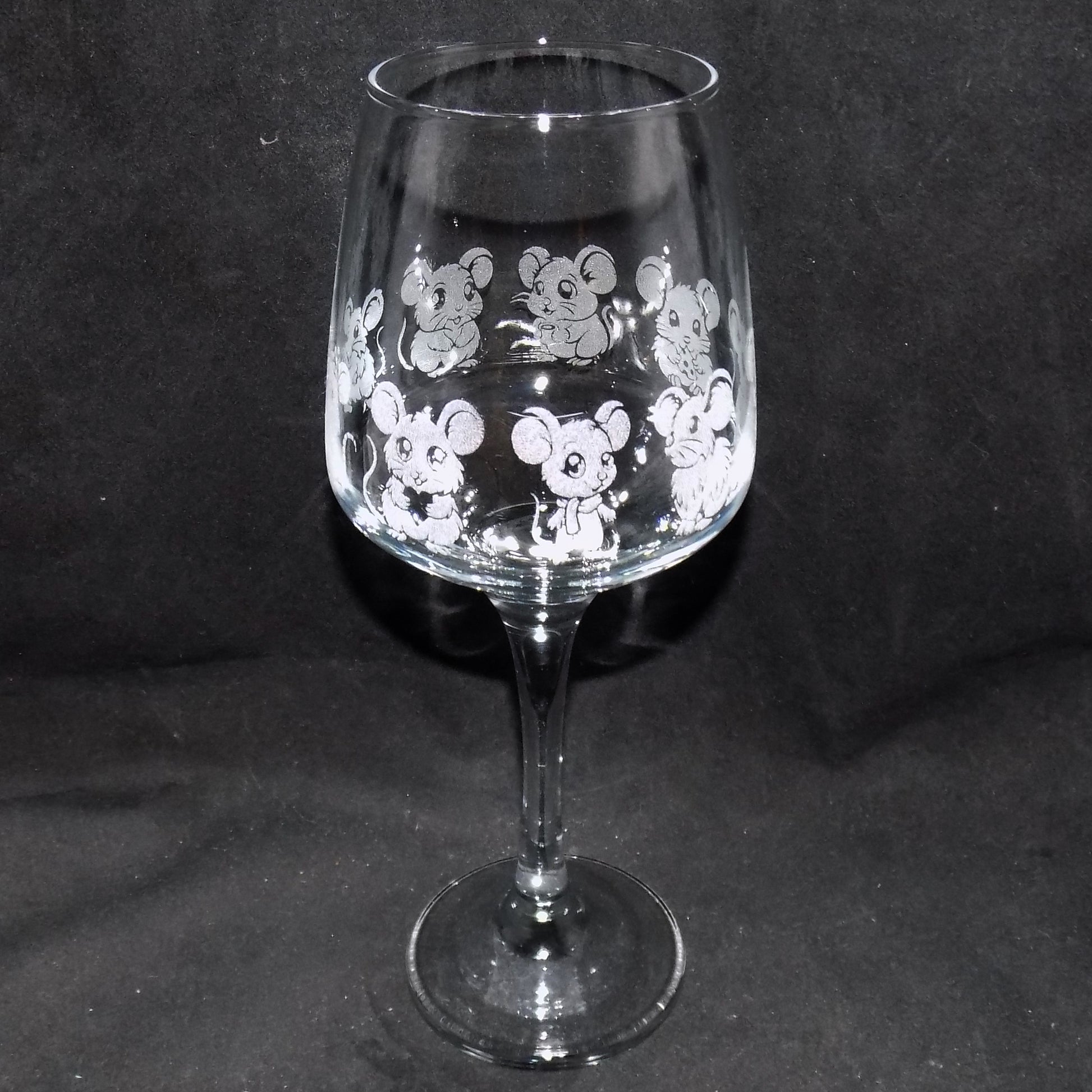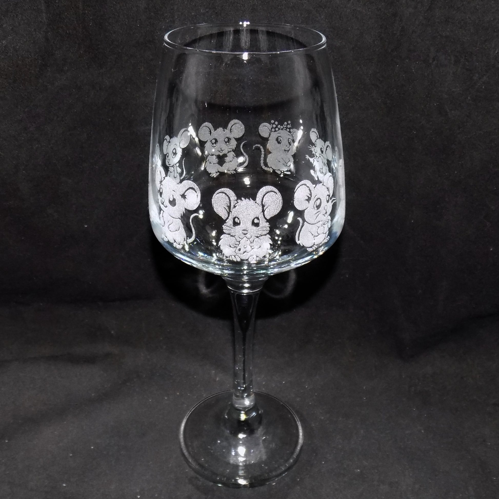 This unique wine glass, featuring cute mouse designs around the base of the bowl. It makes a thoughtful gift for any mice lover or a charming addition to your own collection. Perfect for special occasions or everyday use, it combines fine craftsmanship with personal flair, suitable for both alcoholic and non-alcoholic beverages.